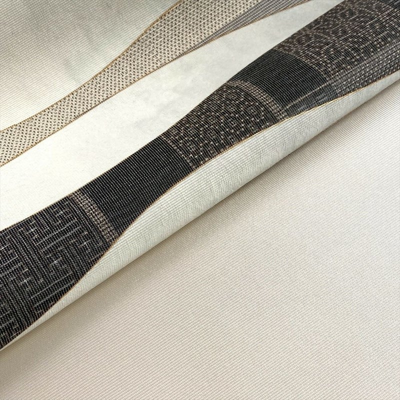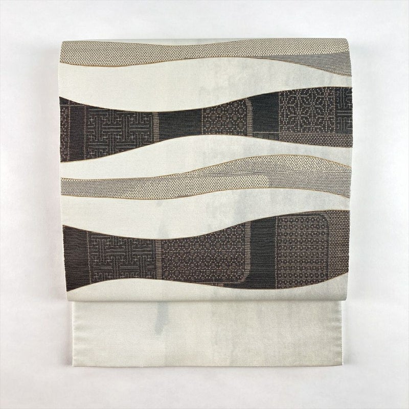 生成と薄青の柔らかな色調に、抽象的なモダン柄をあしらった六通袋帯。