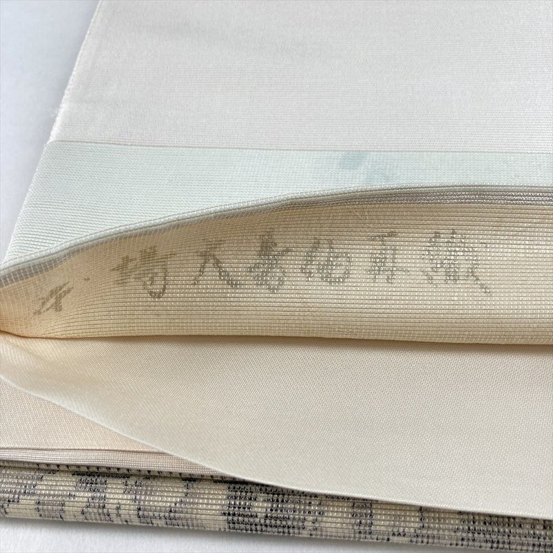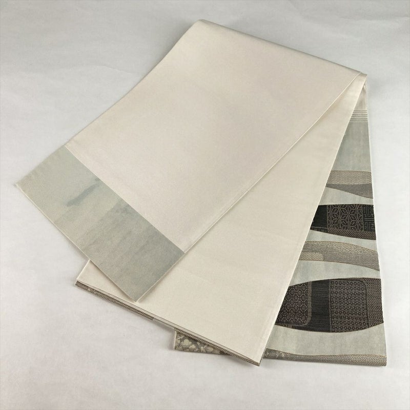 (中古)袋帯 生成 薄青 カジュアル セミフォーマル 六通 織り 抽象柄 モダン 絹