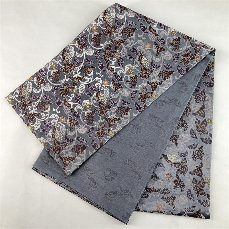 (中古)袋帯 グレー セミフォーマル 六通 織り 銀糸 葡萄唐草 絹