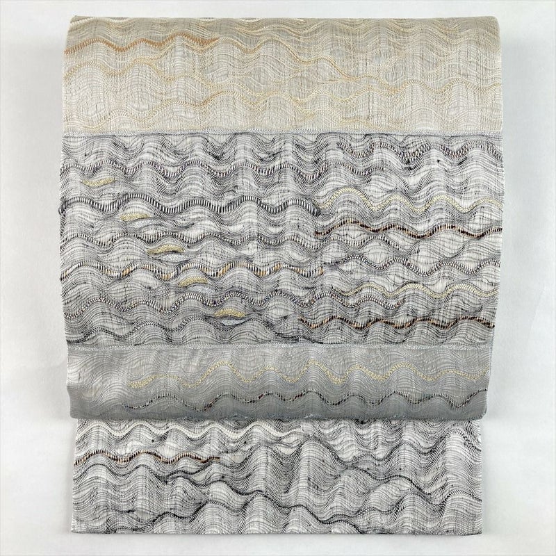 (中古)袋帯 グレー カジュアル セミフォーマル 六通 掬い織り 波 抽象柄 絹