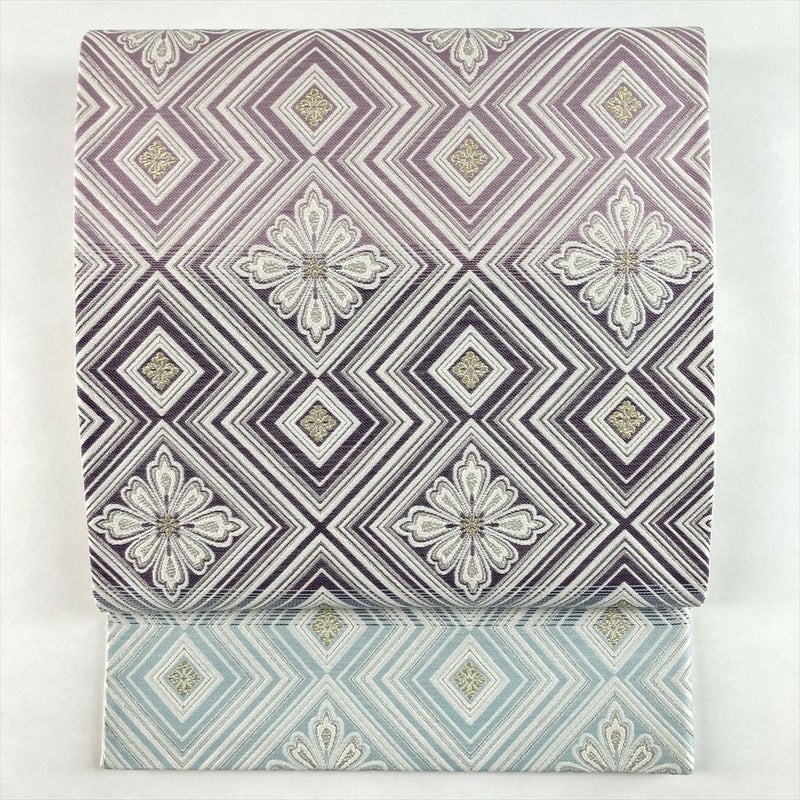 (中古)袋帯 薄紫 水色 セミフォーマル 六通 織り 銀糸 菱取り 華文 絹