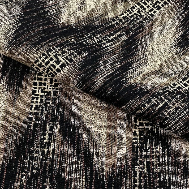 絣調の素朴さに、矢羽根の古典的な柄をモダンに昇華した意匠です。