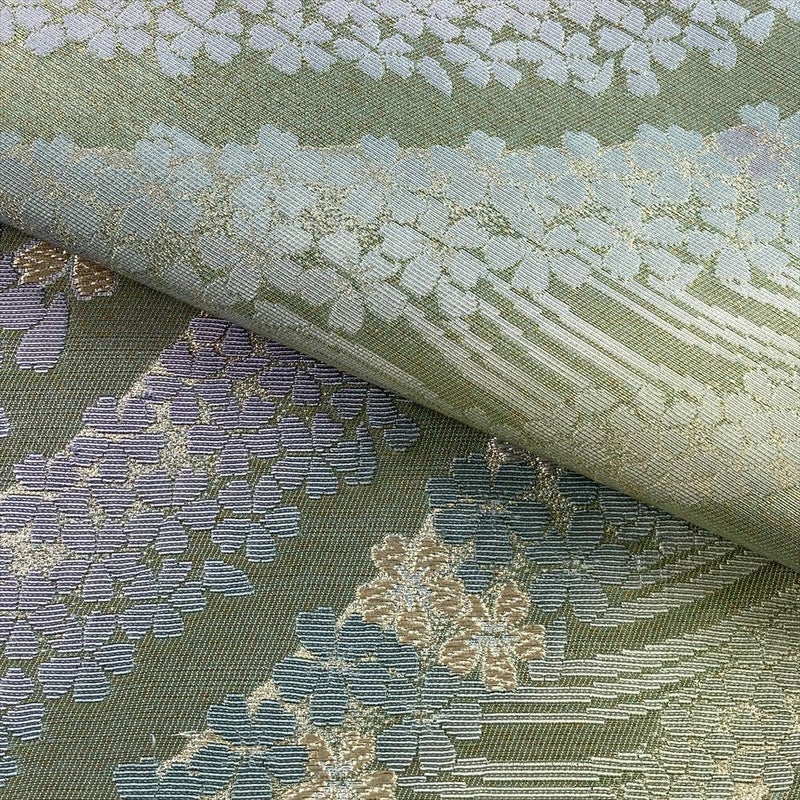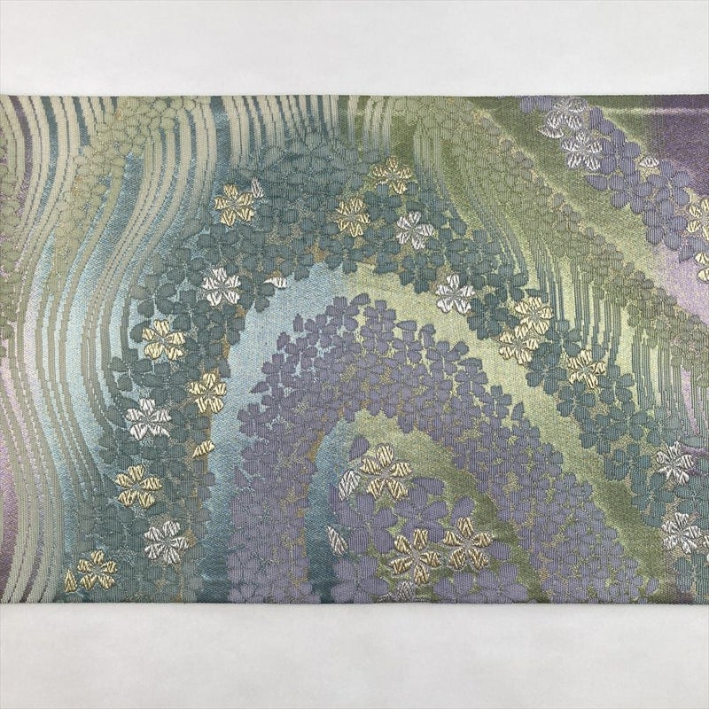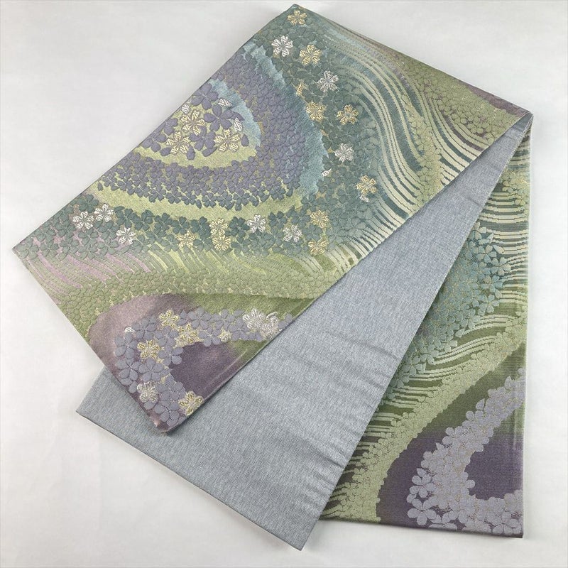 (中古)袋帯 緑 紫 セミフォーマル フォーマル 全通 織り 金糸 銀糸 流水 桜尽くし 絹