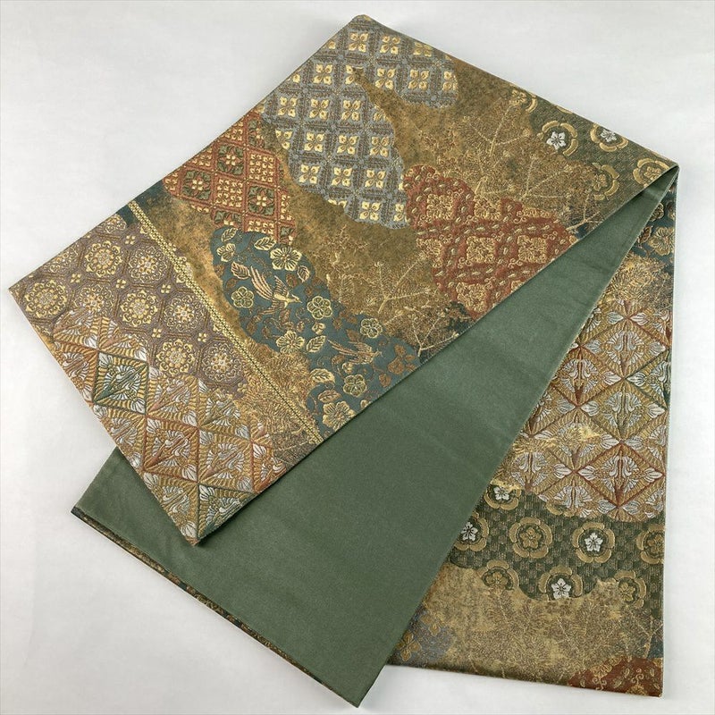 (中古)袋帯 金緑 フォーマル 六通 織り 引き箔 金糸 雲取り 天平文 絹