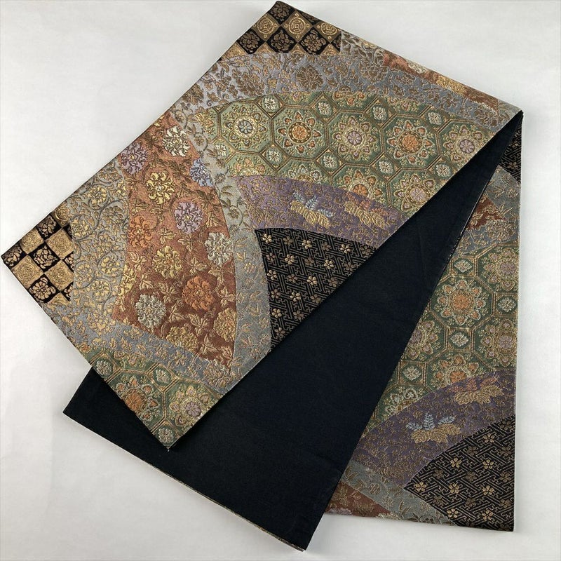 (中古)袋帯 黒 セミフォーマル 六通 織り 引き箔 金糸 裂き取り 天平文 絹