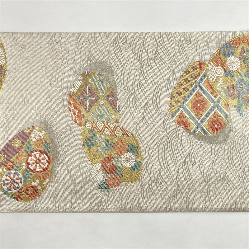 (中古)袋帯 アイボリー 生成り セミフォーマル フォーマル 六通 織り 引き箔 金糸 銀糸 波 貝合わせ文 絹