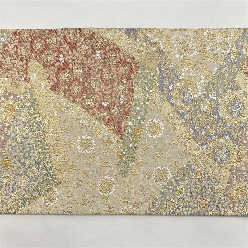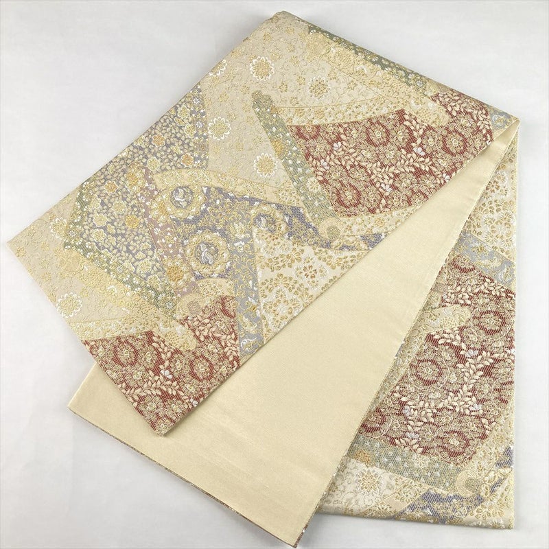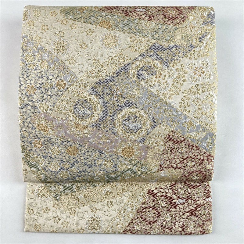 (中古)袋帯 アイボリー 金 セミフォーマル フォーマル 六通 織り 金糸 宝巻 天平文 絹