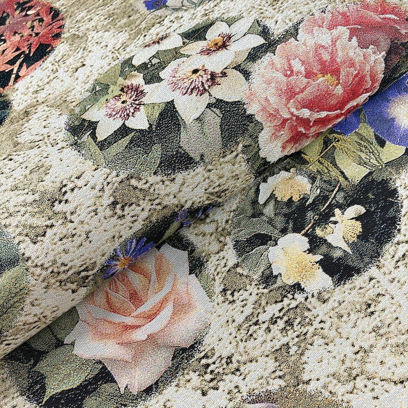 季節の花々が咲き誇る、絵画のように写実的な意匠。