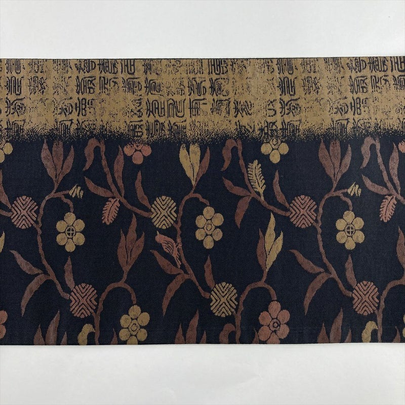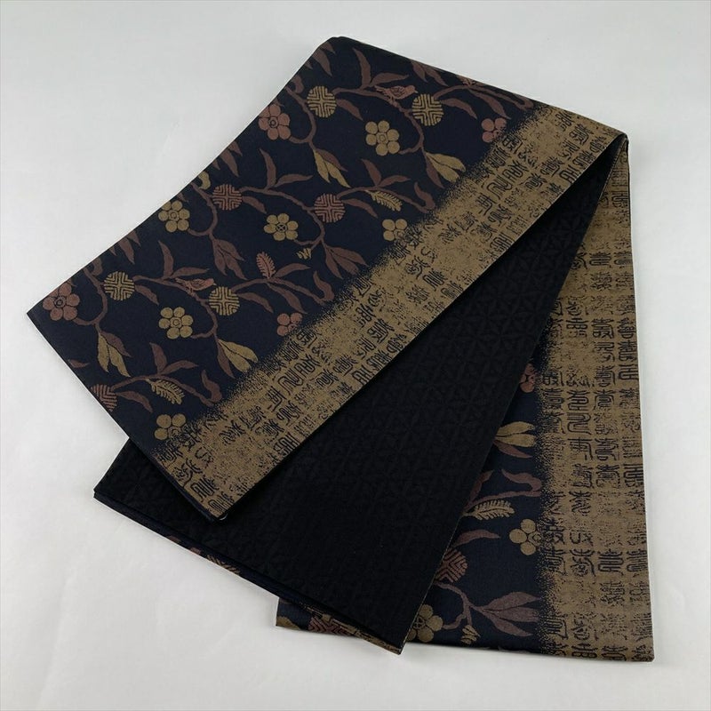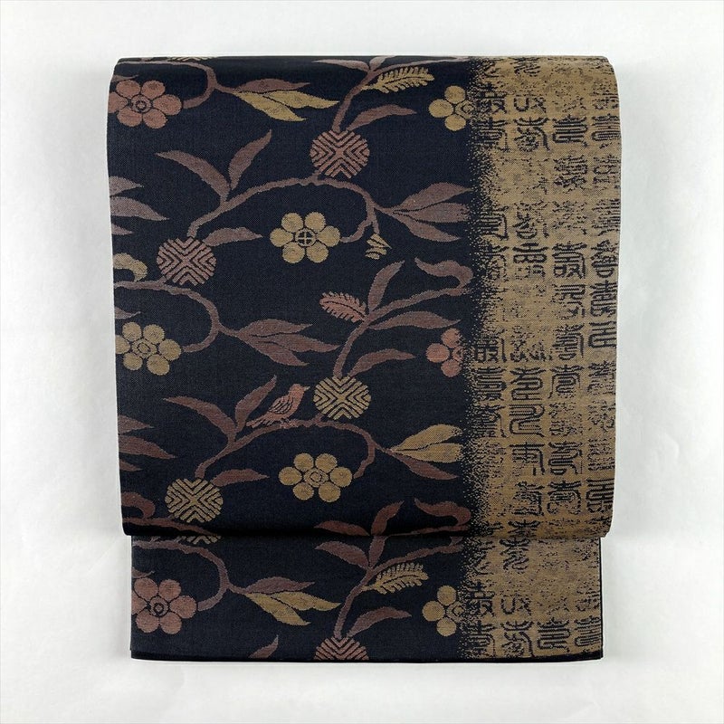 (中古)袋帯 黒 セミフォーマル 六通 織り 笹蔓 鳥 文字 絹