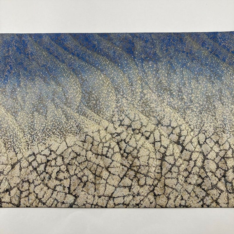 金と青の色彩を重ね、寂寥とした静かな情景を表現した全通袋帯。