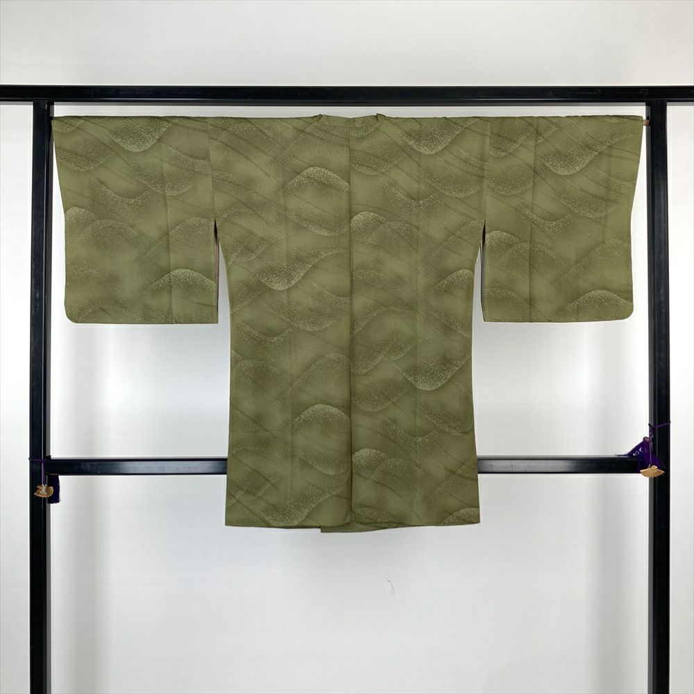 他の画像を見る (中古)リユース着物 道行コート 緑 カジュアル はおりもの 地紋織り 山並み たたき染め おしゃれ羽裏 袷 未洗い【身丈】89cm 【裄丈】68cm MS765 未洗い ¥ 2,750 税込 お気に入りに登録する