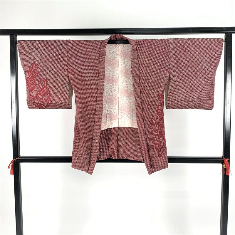 (中古)羽織 赤 袷 鹿の子絞り 草花 未洗い【身丈】80cm【裄丈】68.5cm