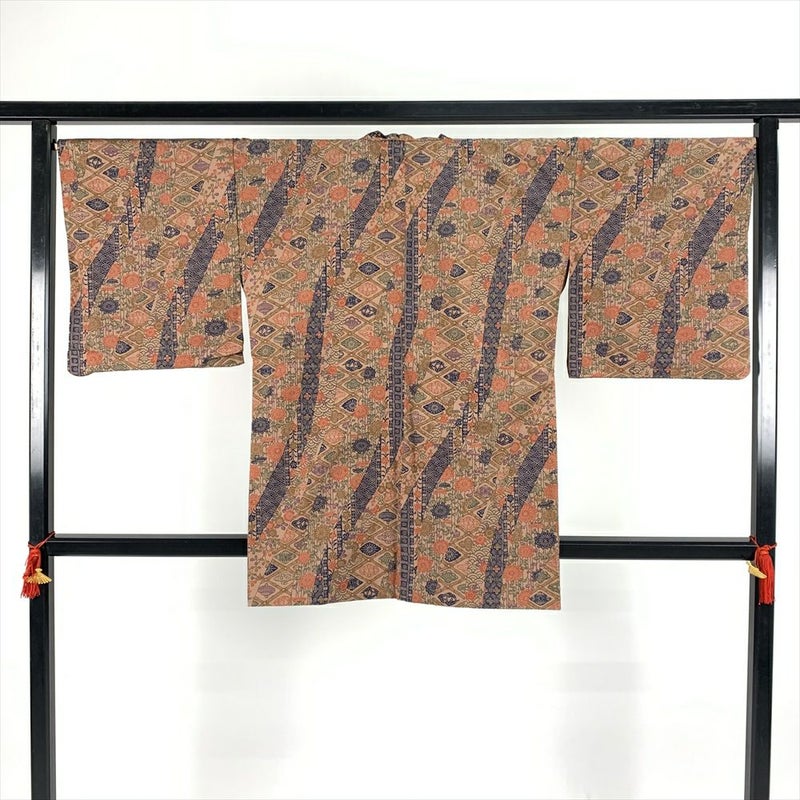(中古)道中着 茶 袷 紬地 変わり道長取り 古典柄 未洗い【身丈】90cm【裄丈】68.5cm