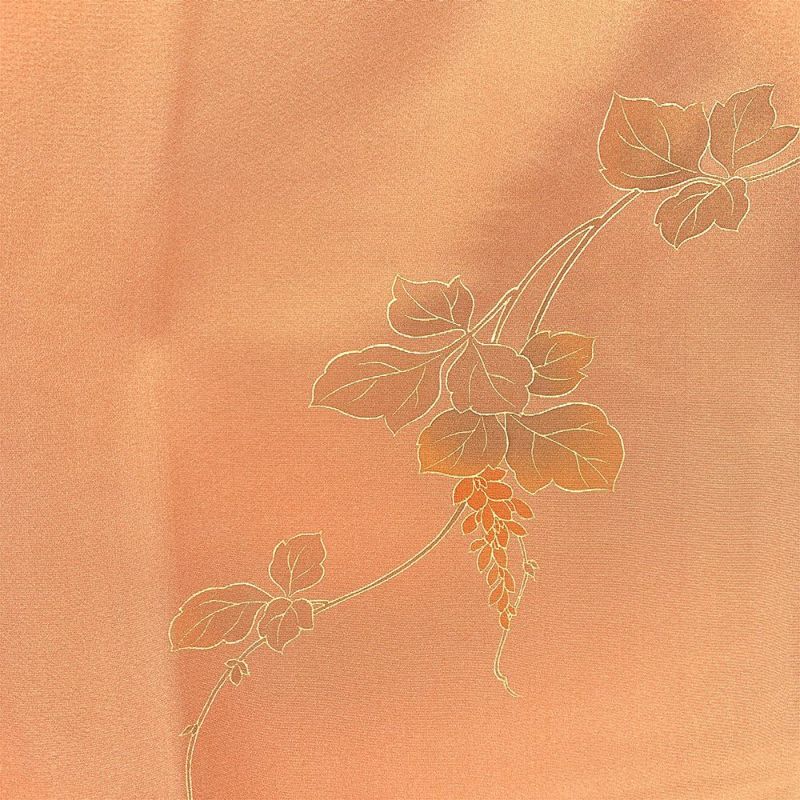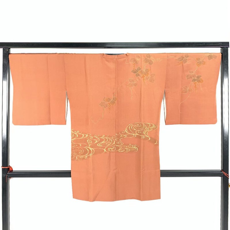 テラコッタ調の茶色地に観世流水が金彩で描かれ、背中から袖にかけて藤が描かれた上品な道行コートです。前身頃と袖にシミや汚れが見られますが、ご利用いただけるレベルだと思います。