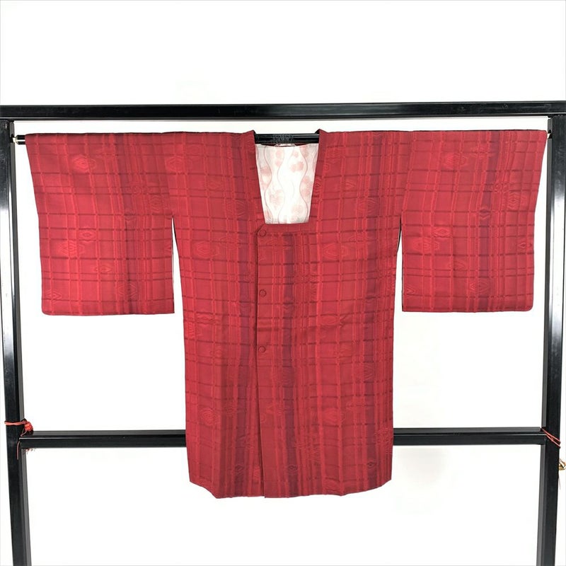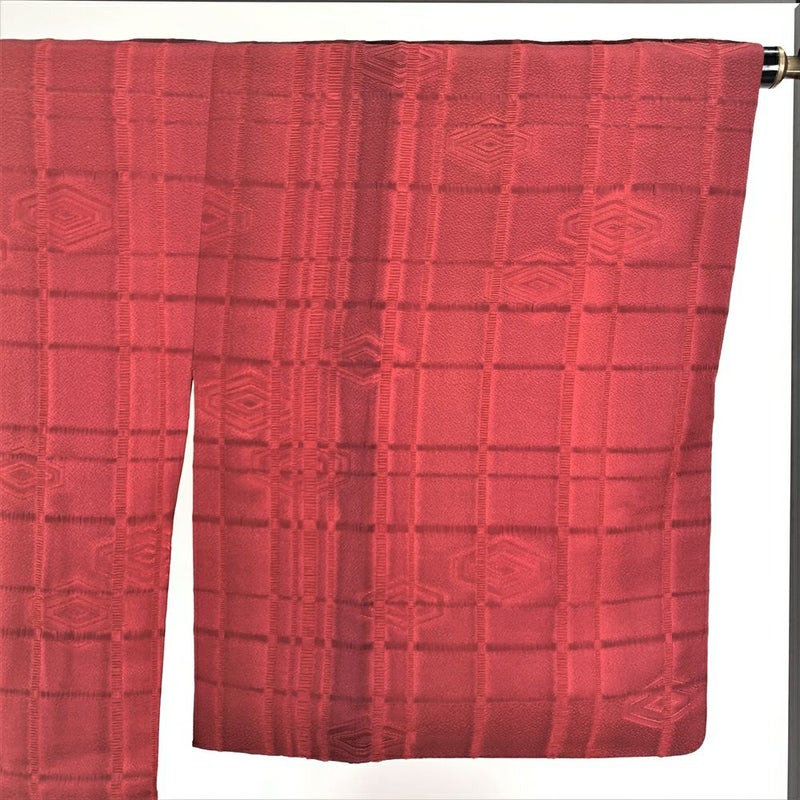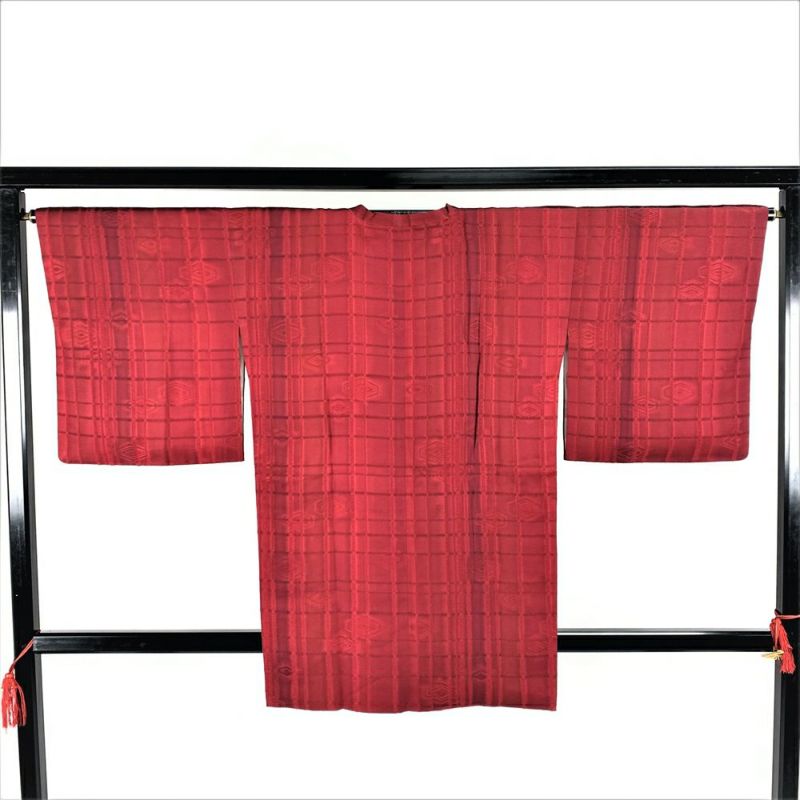 (中古)道行コート 赤 袷 変わり格子 菱 未洗い【身丈】87.5cm【裄丈】66.5cm