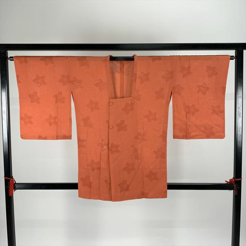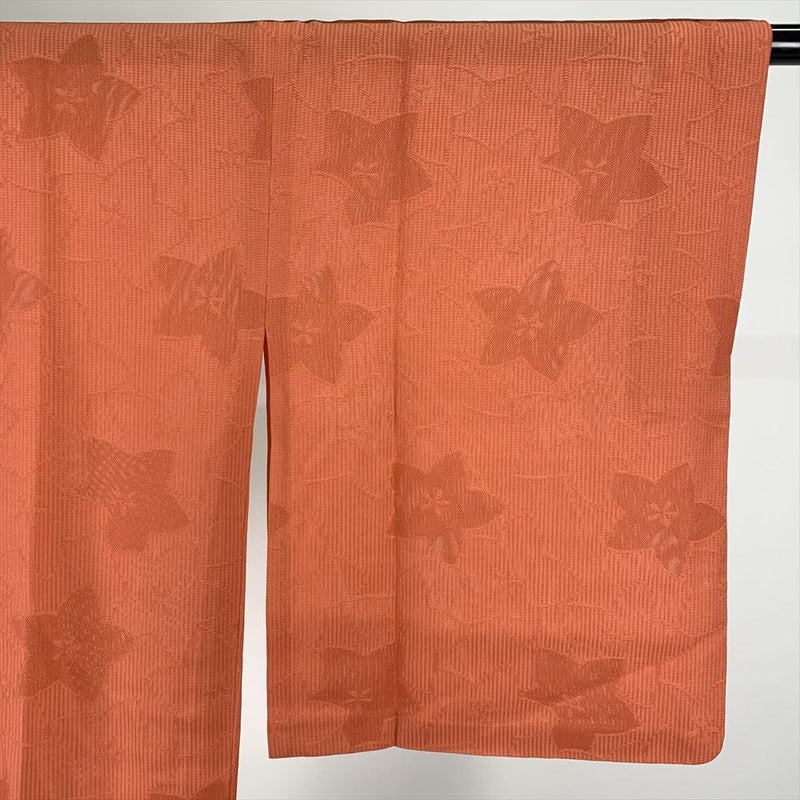 テラコッタ系のオレンジ地で、縦縞と花柄の地紋織りの単衣道行コートです。