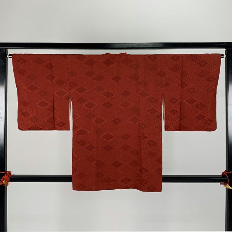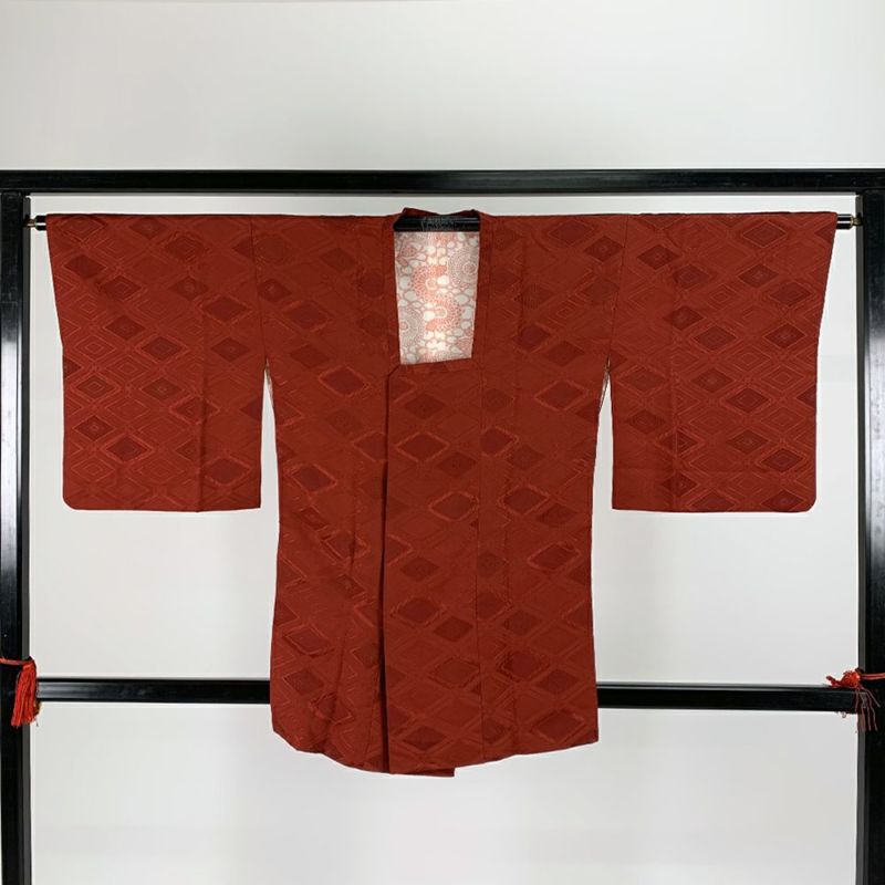 (中古)道行コート 赤 袷 花菱 地紋織り 未洗い【身丈】84.5cm【裄丈】65.5cm