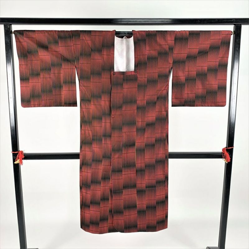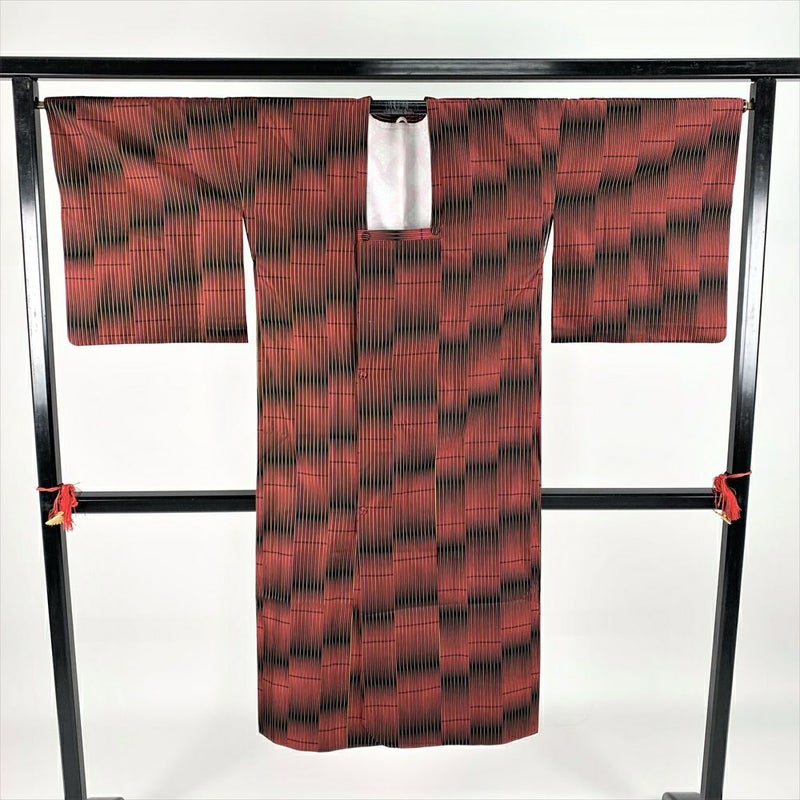 (中古)雨コート 赤 単衣 ひとえ 草 縦縞 ストライプ レトロ 未洗い【身丈】126.5cm【裄丈】69.5cm
