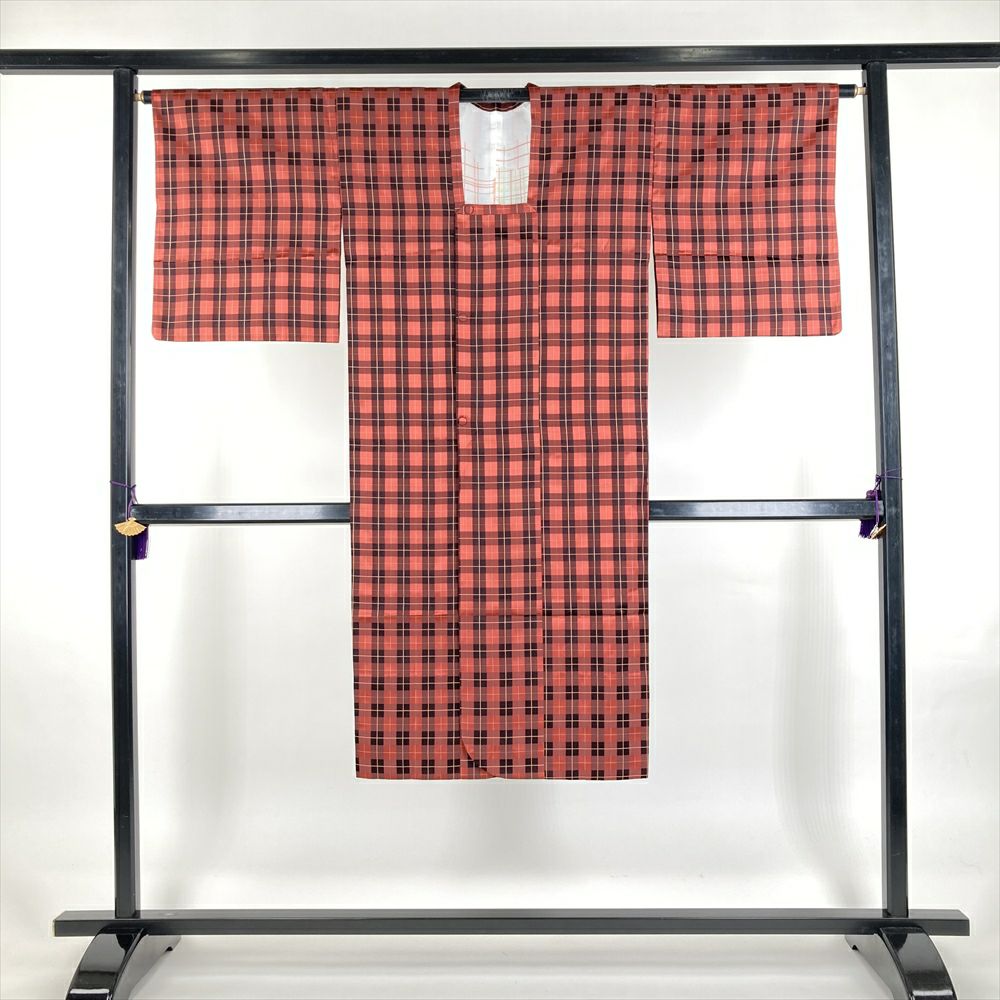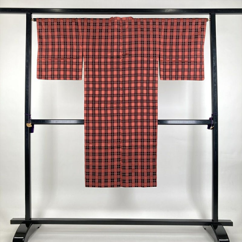 (中古) 雨コート ピンクオレンジ 翁格子 単衣 未洗い【身丈】124.5cm【裄丈】65.5cm