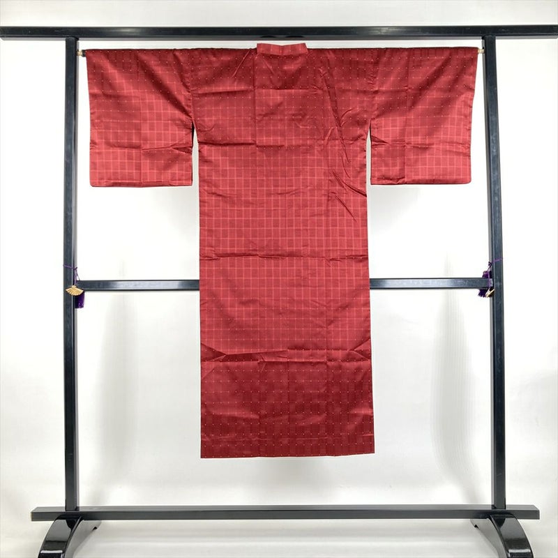 (中古) 雨コート 臙脂 赤 変わり格子 単衣 未洗い【身丈】131.5cm【裄丈】66.5cm