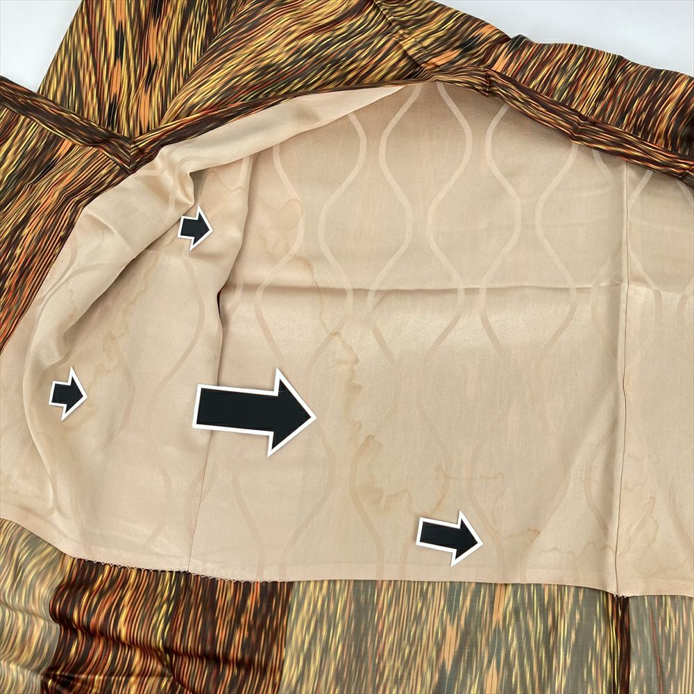 雨コート(あまこーと)は着物の上から着用することで、雨や泥はねだけでなく塵からも着物を守ります。雨コートの形にはいくつか種類がありますがワンピースタイプ(長コート)と二部式が着やすくて人気です。羽裏にシミ汚れがございます。保存臭がややございます。たたみシワなど若干の使用感がございます。