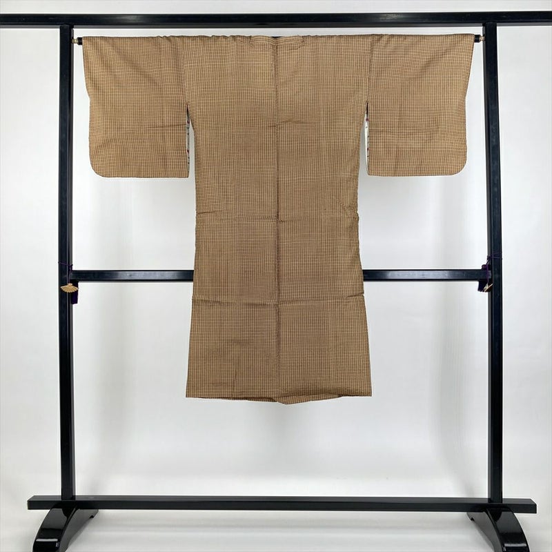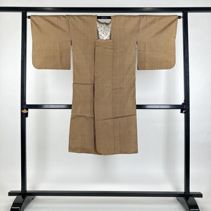 (中古) 雨コート 茶 黄色 格子 袷 未洗い【身丈】115cm【裄丈】66.5cm