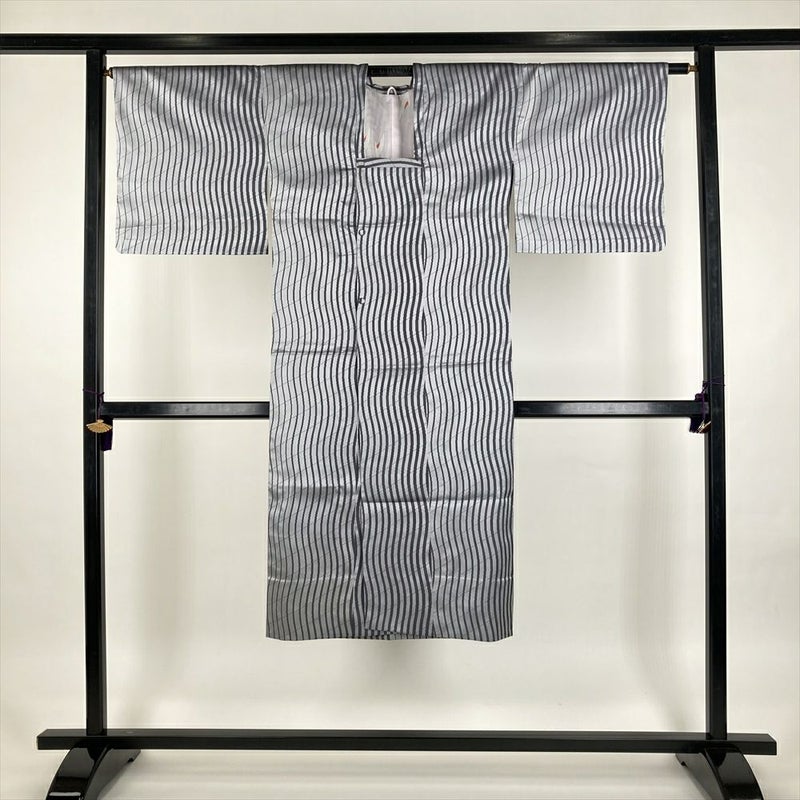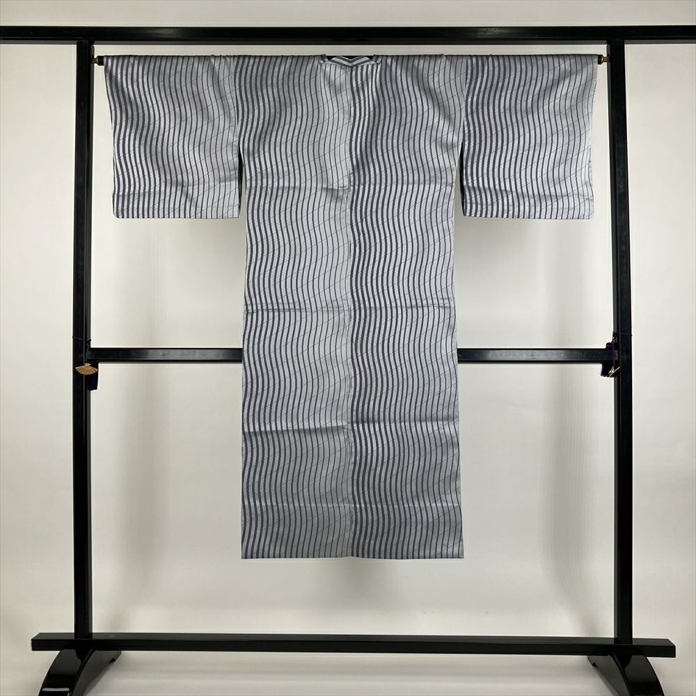 (中古) 雨コート 薄灰 濃灰 グレー よろけ縞 単衣 未洗い【身丈】126cm【裄丈】66.5cm