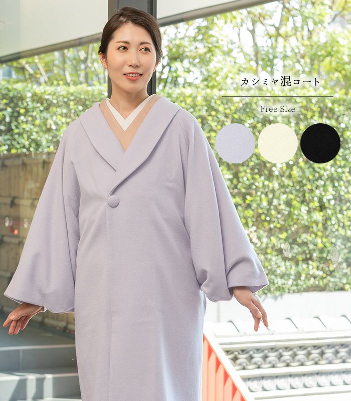 他の画像を見る (新品)カシミヤ混コート(カシミヤ10%) 都粋 通常価格 ¥ 85,800 のところ ¥ 63,800 税込 コート 冬コート 着物 へちま衿 フリーサイズ シンプル 無地 あったか くるみボタン スナップボタン オフホワイト アイボリー 黒 ブラック 薄藤 ラベンダー 薄紫 お気に入りに登録する