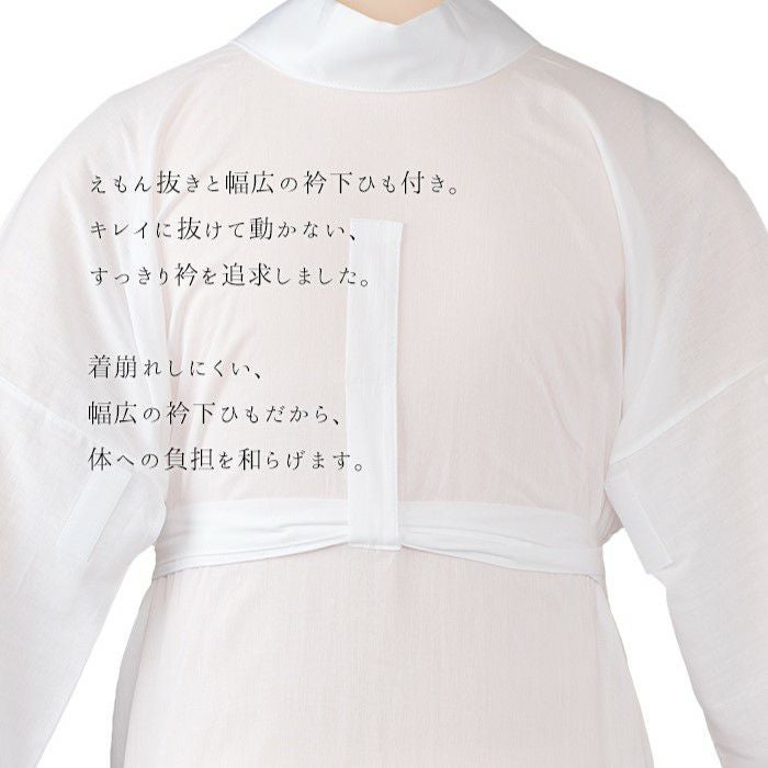衣紋抜きと幅広の衿下ひも付きなので、着崩れしにくくすっきりとした衿元を作り、体の負担も和らげます。