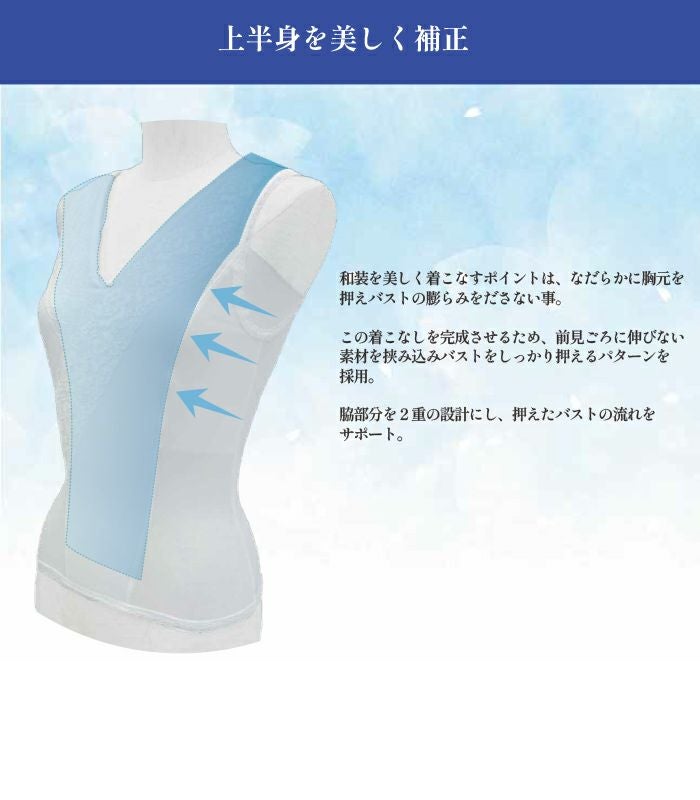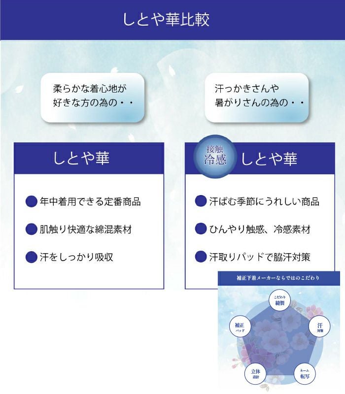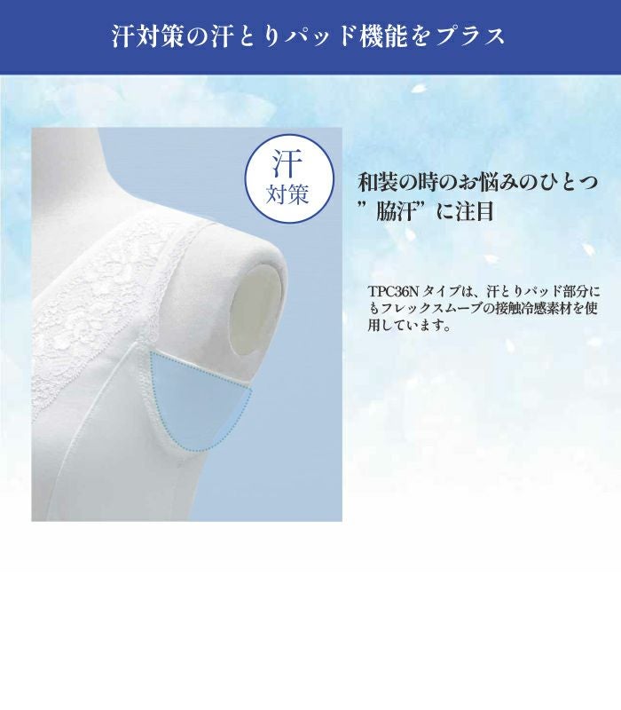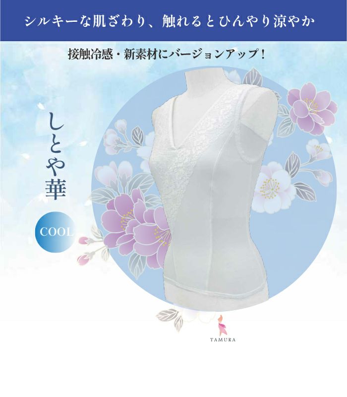 補整下着メーカー「タムラ」が和装をきれいに着るために開発した、おしゃれ着物、ブライダル、訪問着、冠婚葬祭に着用いただける「着心地」と「機能性」を両方重視した理想の和装インナー「しとや華(しとやか)」の「クールタイプ(接触冷感)」です。