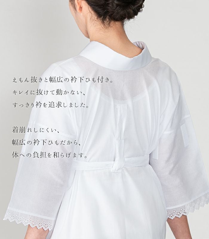 衣紋抜きと巾広の衿下ひも付きなので、着崩れしにくくすっきりとした衿元を作り、体の負担も和らげます。