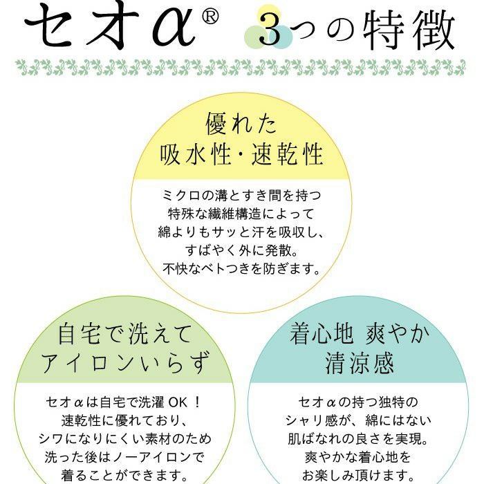吸水速乾の東レセオα素材だから滑りが良く、一日中ずっとサラサラ!