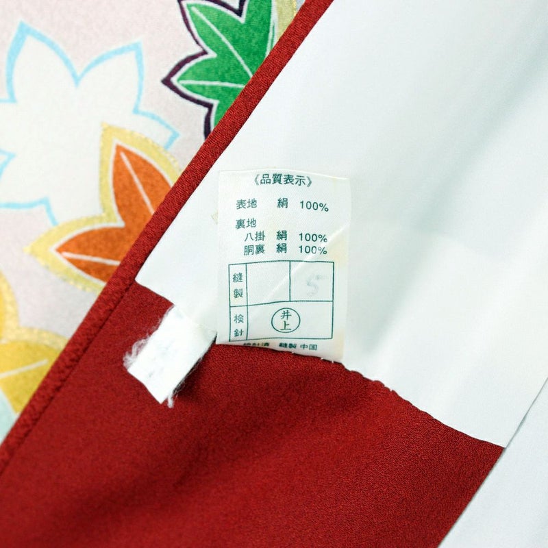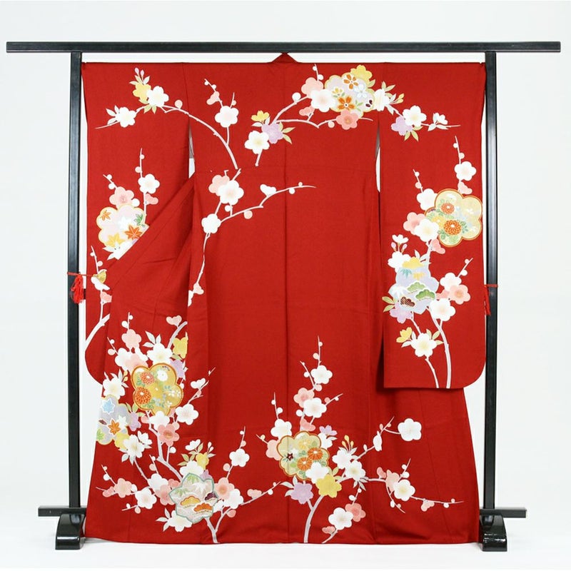(中古)振袖 赤地 梅 菊 楓 桜 橘 古典 刺繍 袷 L【身丈】167cm【裄丈】67cm
