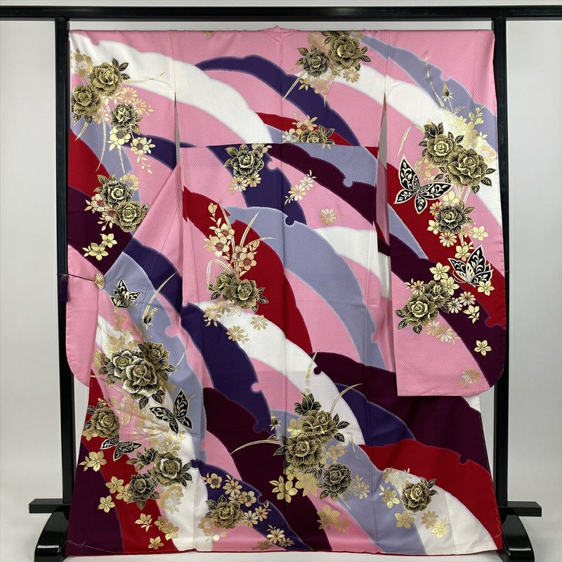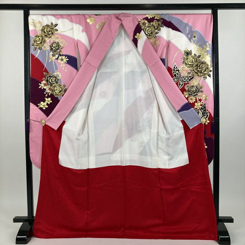 (中古) 振袖 ピンク色 フォーマル 地紋織り染め 金彩 四季花 バラ 蝶 袷【身丈】167cm【裄丈】71.5cm