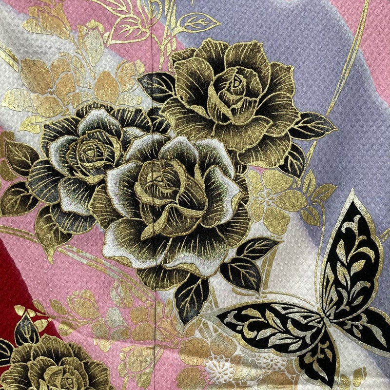 ピンクの地紋織りに、金彩で描かれた薔薇と蝶が華やかに咲き誇る振袖。慶長柄調の古典的な美しさと、現代的な感性が融合した、艶やかな一着です。