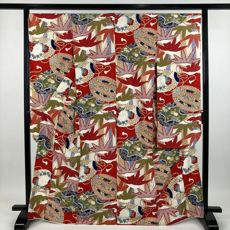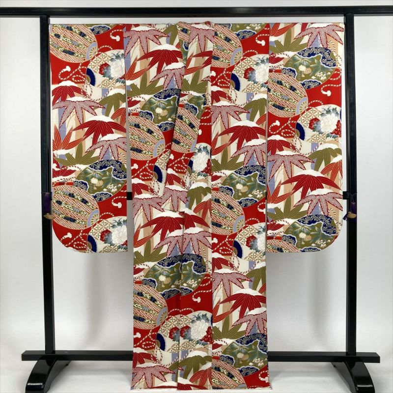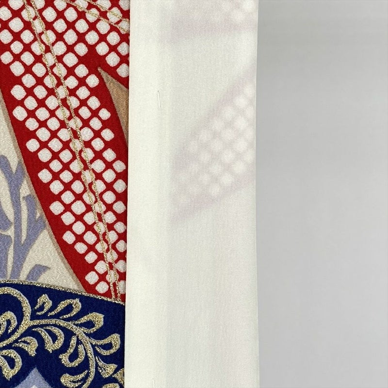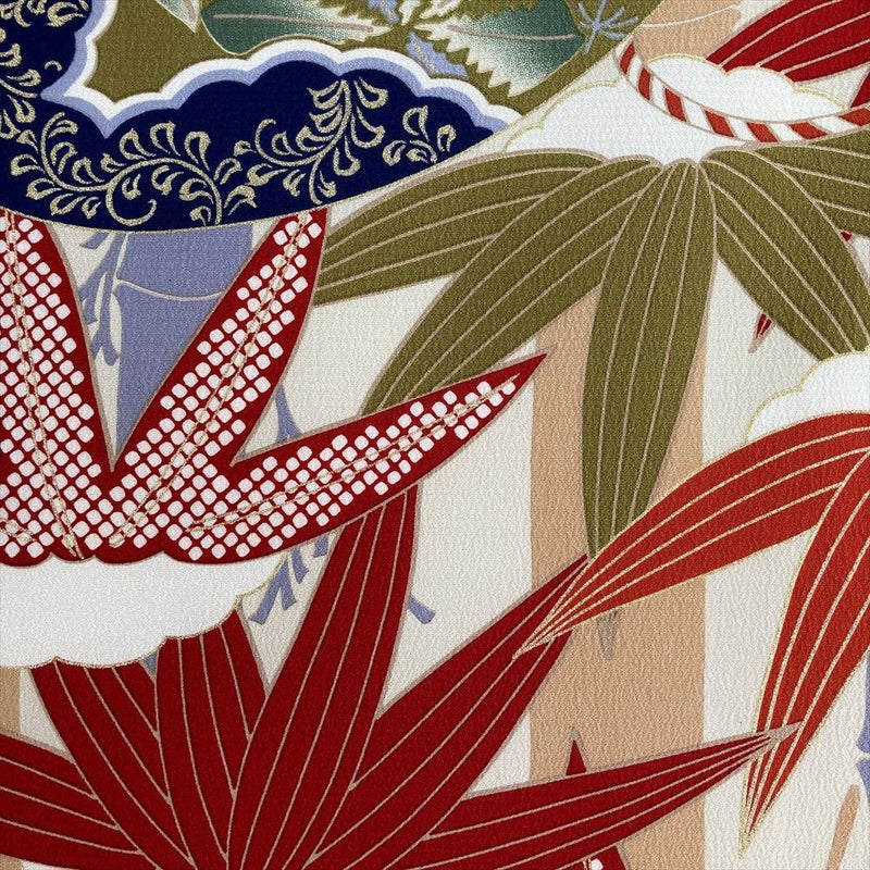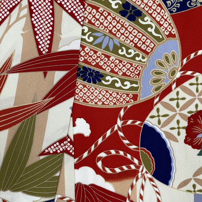 鮮やかな赤地に、吉祥文様が華やかに咲き誇ります。古典柄でありながら、モダンな配色とデザインが、あなたをひときわ美しく彩ります。