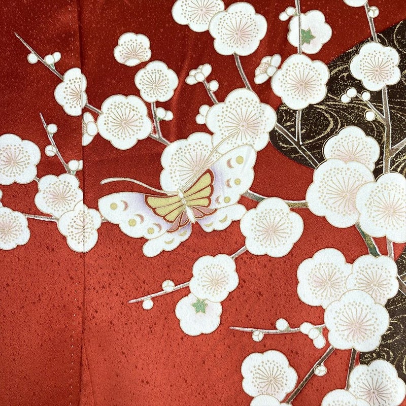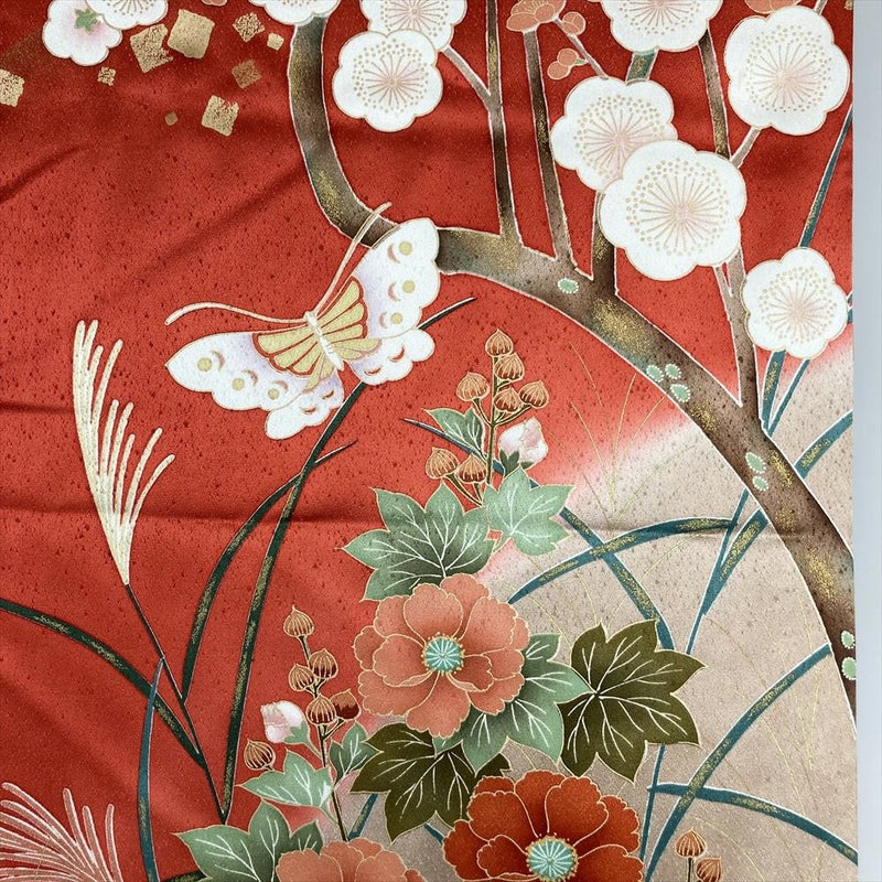 (中古)振袖 赤 金彩 刺繍 霞取り 四季の草花 蝶 袷 S【身丈】158.5cm【裄丈】69.5cm