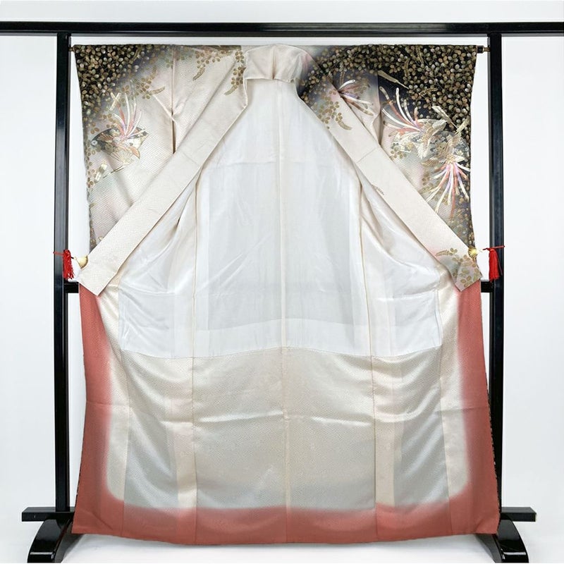 肩から裾へと美しく広がるぼかし染めは、幻想的な色彩の変化を生み出し、着物全体に奥行きと立体感を与えます。熟練の職人技による繊細なぼかし染めは、まるで絵画のような美しさ。