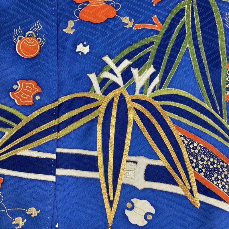 澄み渡る青空のような青色の地に、金彩金駒刺繍で描かれた竹、笹、疋田、宝尽くし。大胆な柄行が、見る人を圧倒する正絹振袖。それは、まるで天空を切り取ったような、壮麗な美しさを放ちます。