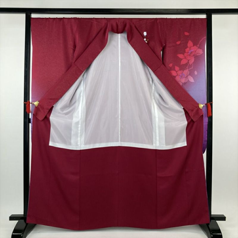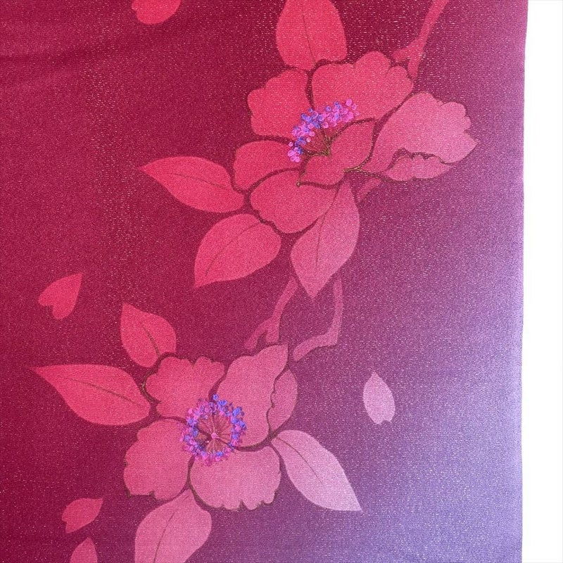 夜空を染めるようなローズ色の地に、金通しとぼかし染めで描かれたシルエットの花。妖艶な雰囲気が漂う正絹振袖は、見る人を魅了する幻想的な美しさを放ちます。