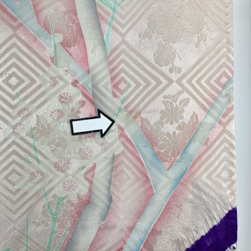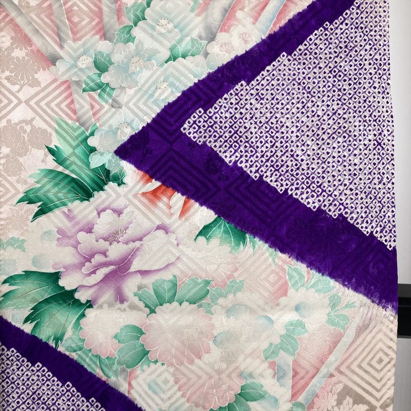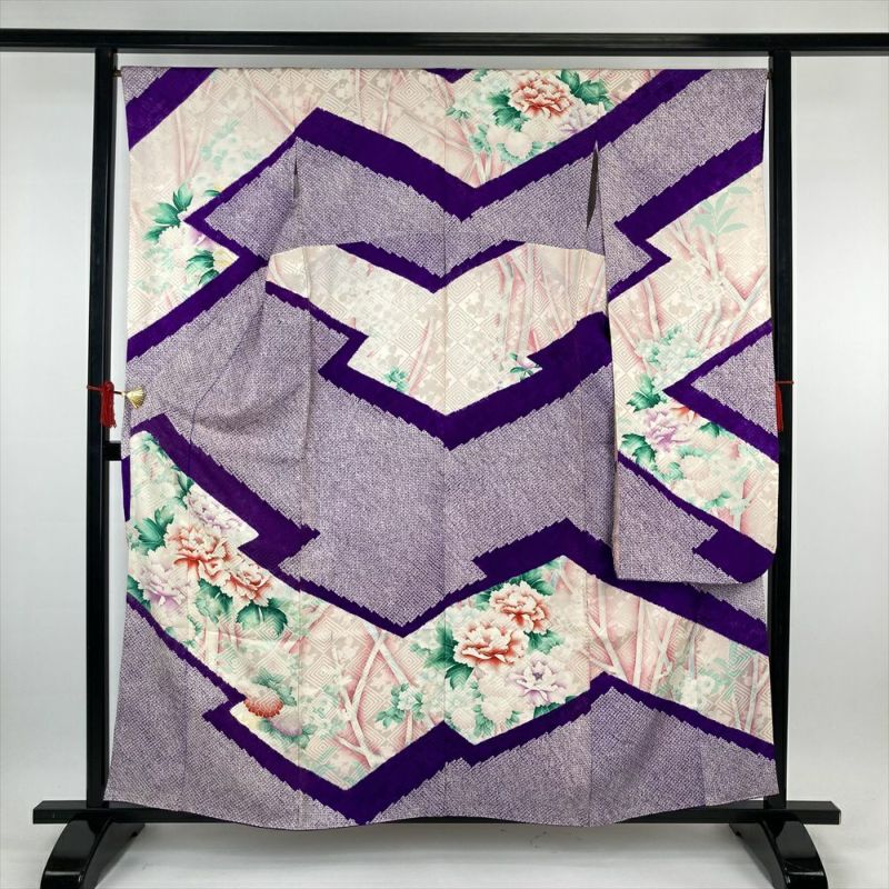 (中古)振袖 紫 フォーマル 地紋織り ぼかし染め 鹿の子絞り 牡丹 菊 椿 梅 笹 袷 S【身丈】157.5cm【裄丈】66.5cm