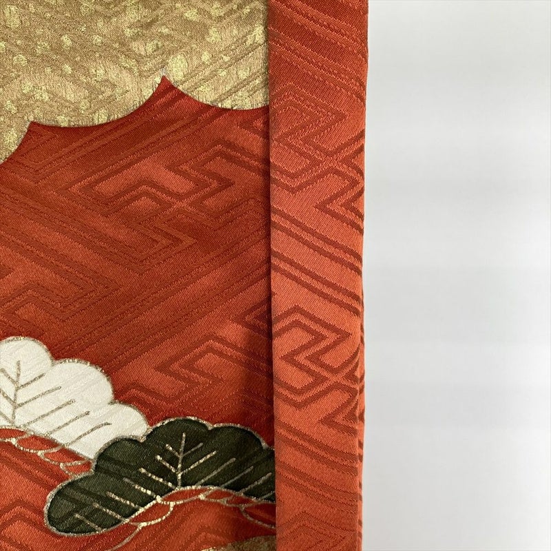 (中古)振袖 オレンジ フォーマル 金駒刺繍 刺繍 金彩 地紋織り 雲取り 霞取り 牡丹 菊 桔梗 桜 椿 松 鴛鴦 流水 袷 M【身丈】160.5cm【裄丈】66.5cm