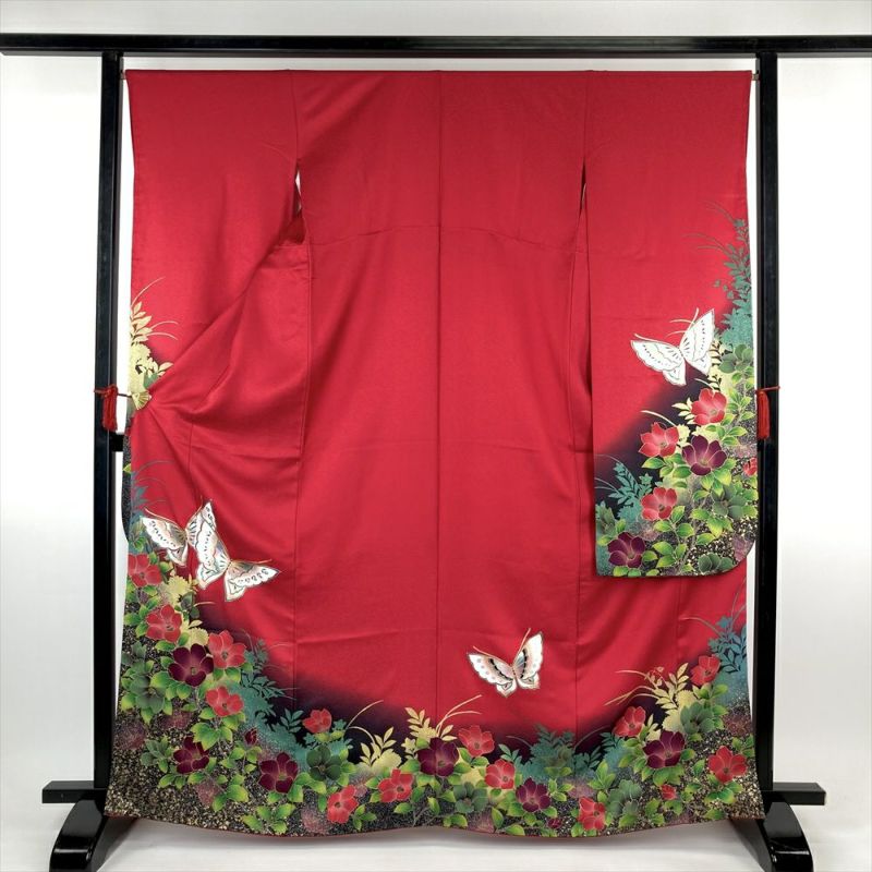 (中古)振袖 赤 フォーマル 金彩 グリッター 蝶 椿 シルエット ぼかし染め たたき染め 袷 M【身丈】162cm【裄丈】67cm