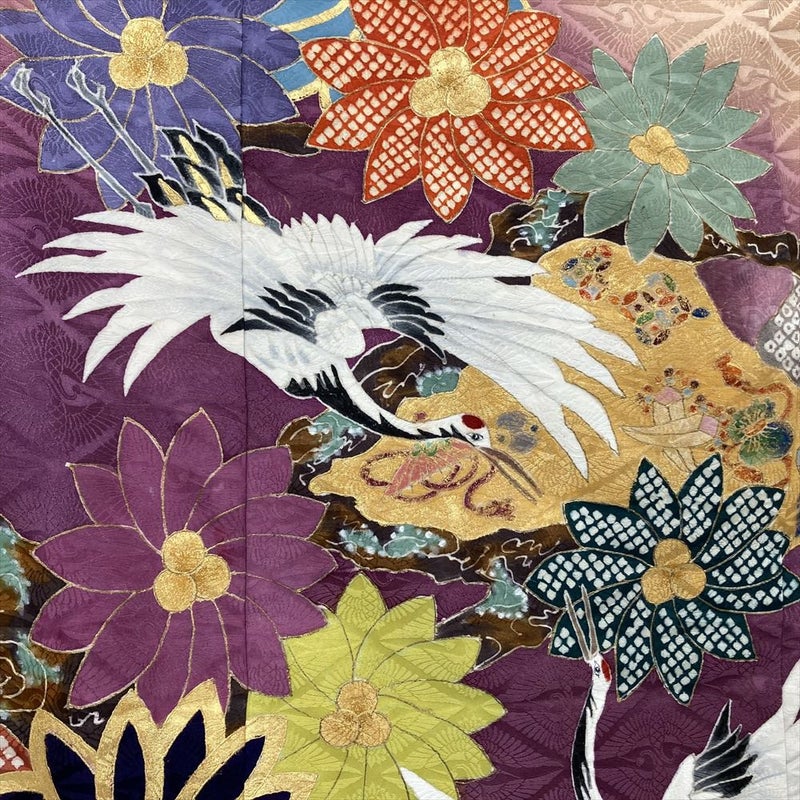 (中古)振袖 紫 フォーマル 三つ紋 地紋織り ぼかし染め 金彩 花 鳥 宝尽くし 袷 M【身丈】163.5cm【裄丈】69.5cm