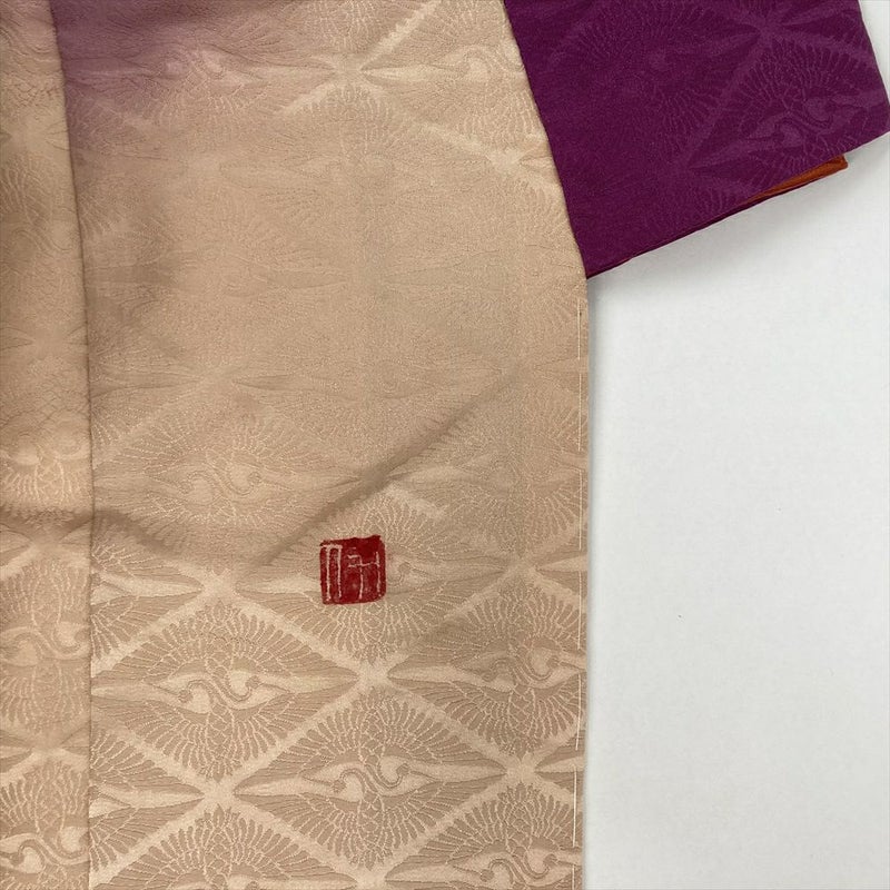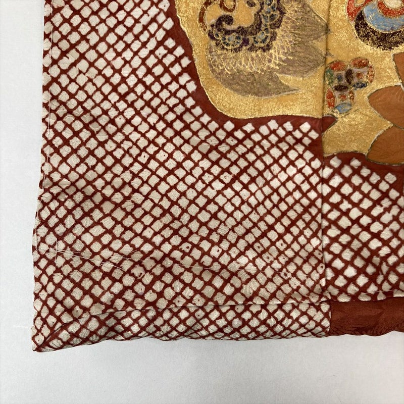打掛の語源「打ち掛ける」は軽くのせるという意味です。 着物の上に打ち掛けて軽く羽織ることから、羽織る着物を打掛と呼びました。細部まで作りこまれたお品です。重ね衿あり。袖口と裾にふきあり。落款あり。衿に汚れ、左後身頃と右前身頃に染料飛びがございます。