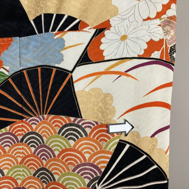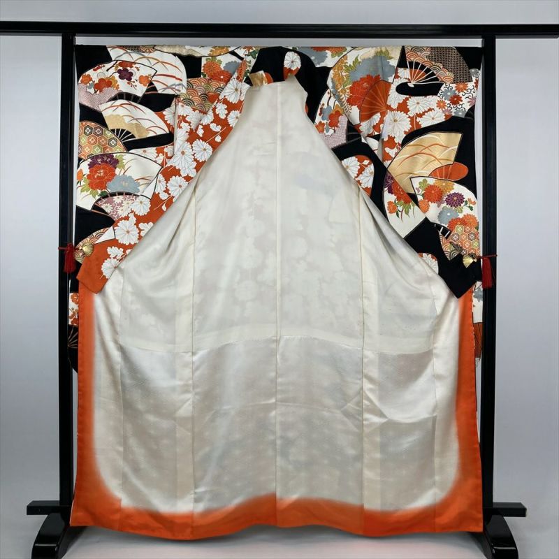 (中古)振袖 黒 フォーマル 地紋織り 金駒刺繍 扇 菊 梅 紅葉 七宝 青海波 鹿の子 袷 M【身丈】160cm【裄丈】68.5cm