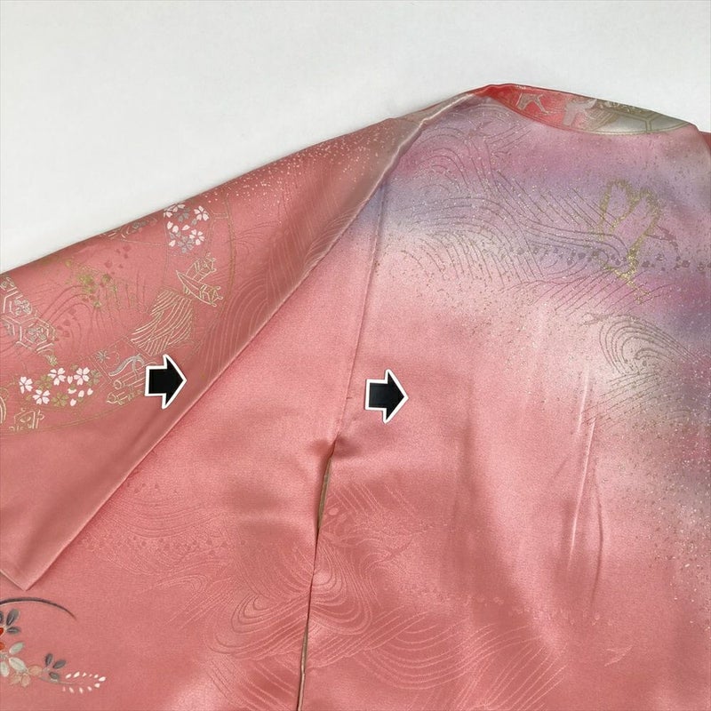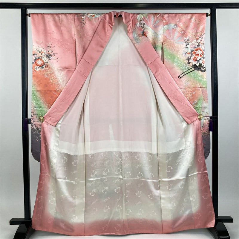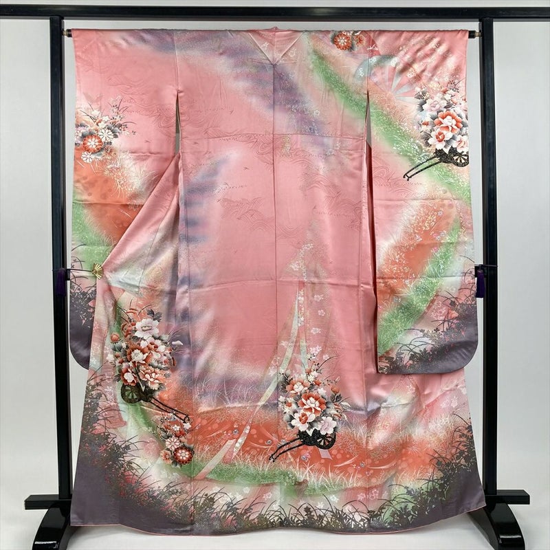(中古) 振袖 ピンク色 フォーマル 地紋織り 染め 金彩 刺繍 花車 袷【身丈】161cm【裄丈】65cm