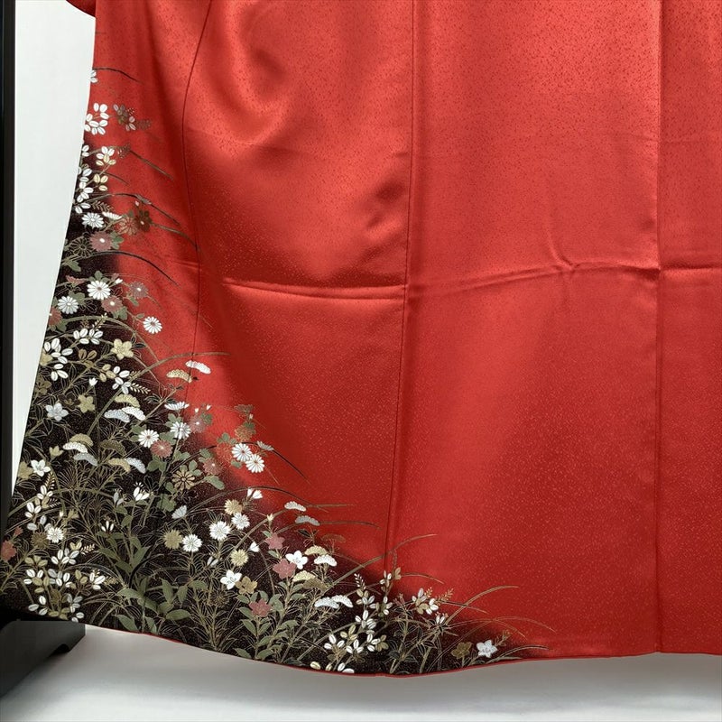 深紅の染めが美しい振袖です。 光沢のある地紋織りの生地に、金彩銀彩で描いた秋草が咲き乱れ、大人の女性の品格を際立たせます。
