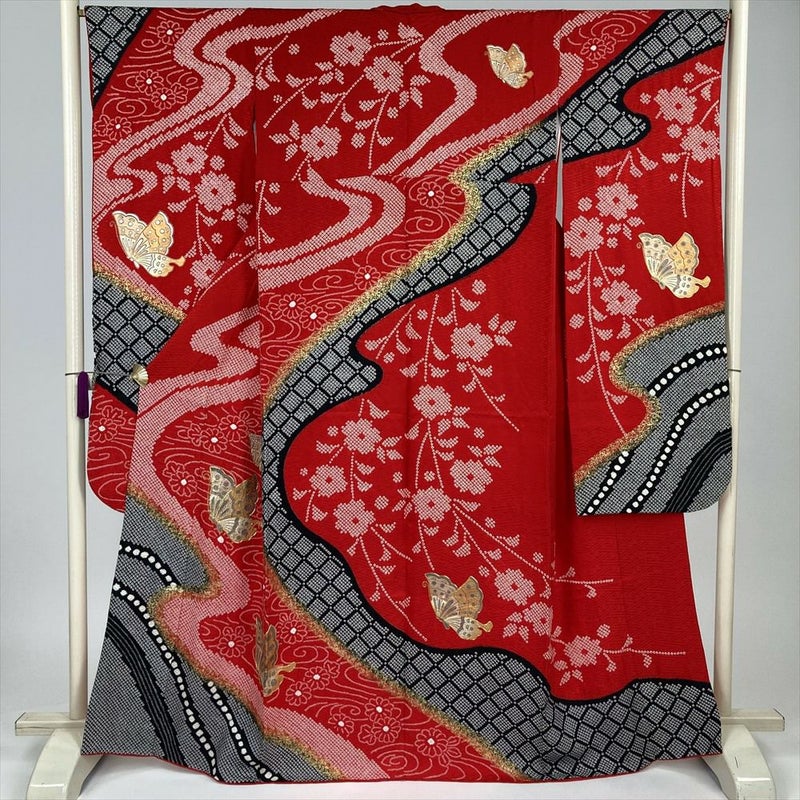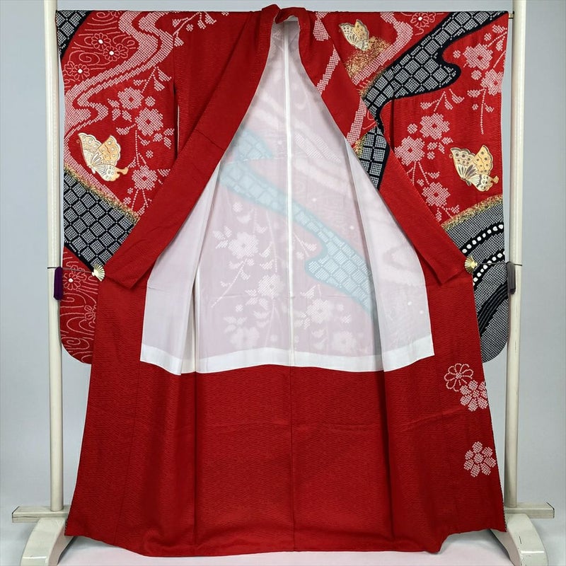 (中古) 振袖 赤 フォーマル 花蝶 袷 絹【身丈】161cm【裄丈】66.5cm