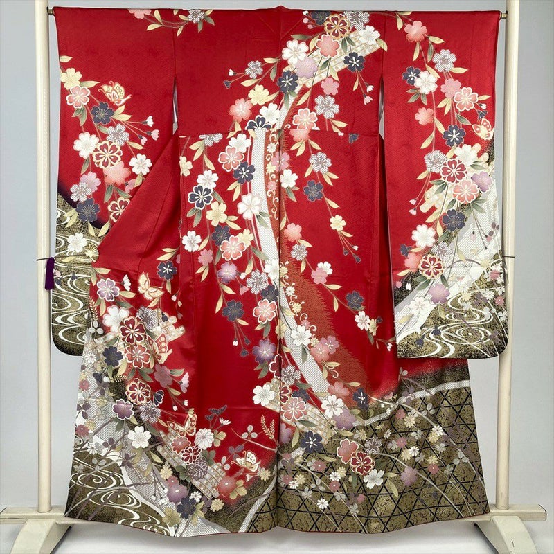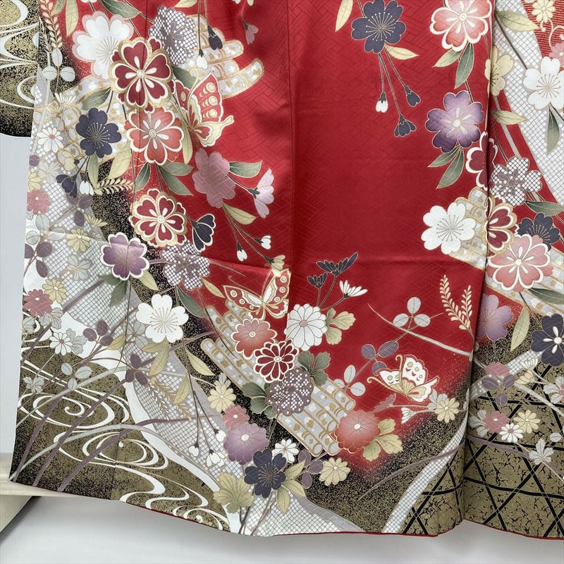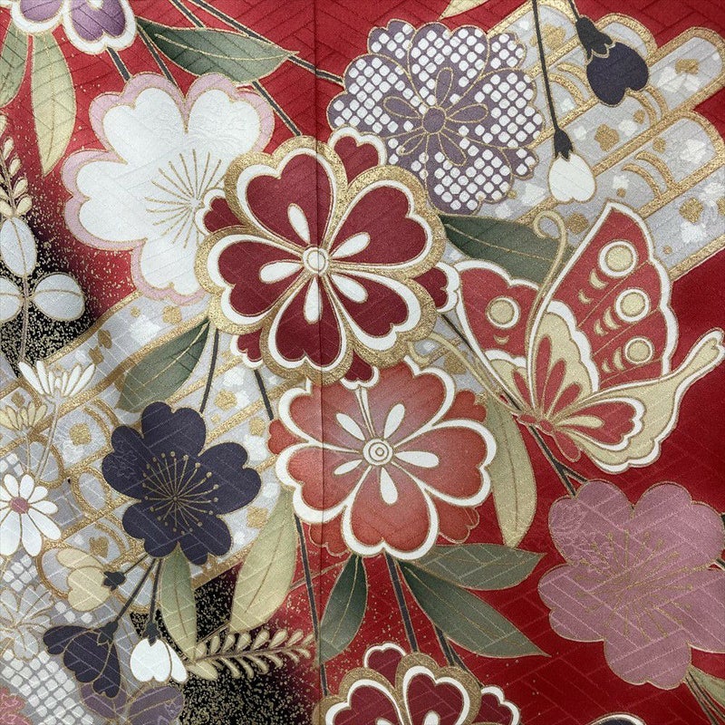 地紋が美しい生地をローズ系の赤色に染め上げ、そこに咲き誇る花筏と優雅に舞う蝶の金彩が、見る人を惹きつけます。